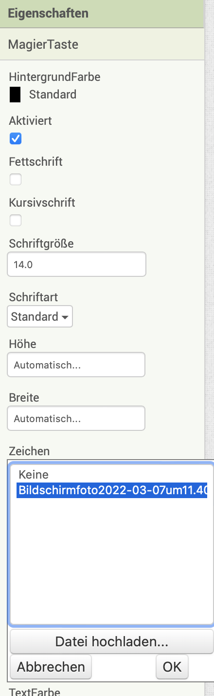 | 3. | Ladet im Bereich Medien das Magier-Bild hoch und verknüpft es mit der Eigenschaft "Zeichen". Passt ggf. die Höhe und Breite der Taste an, damit das Bild sichtbar wird. |