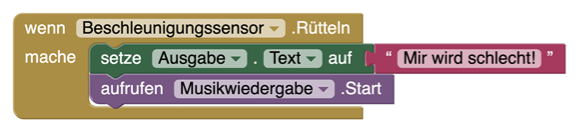 | 2. | Ergänzt weitere notwendige Blöcke, um den Magier beim Schütteln einen lustigen Spruch sagen zu lassen. Tipp: Ihr könnt Elemente per Rechtsklick auch duplizieren. Auf Tablets müsst ihr mit dem Finger länger auf das Element drücken und warten bis das Kontextmenü erscheint. |