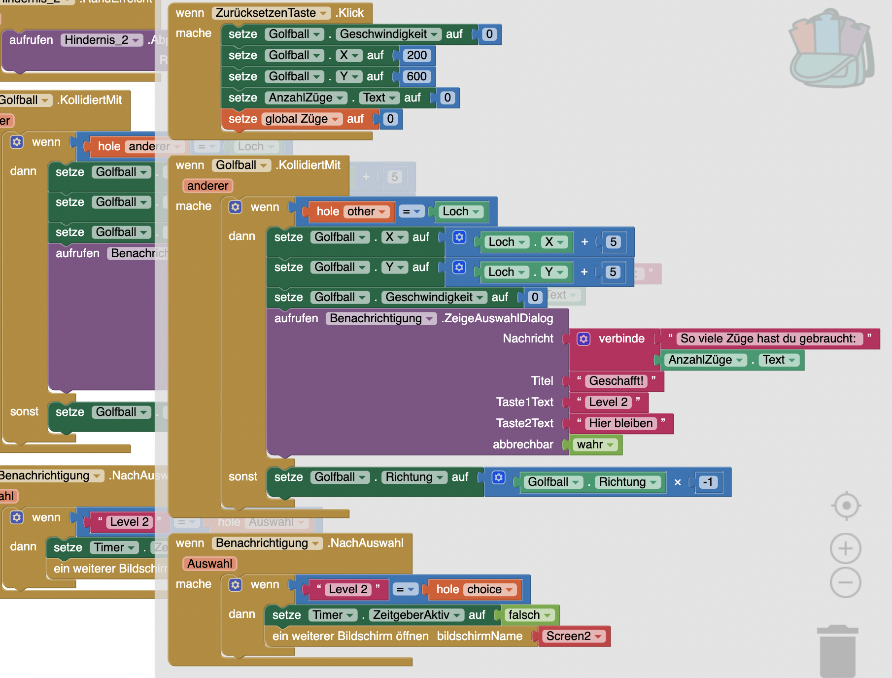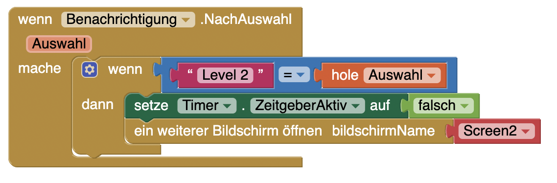 | 1. | Bevor wir das zweite Level gestalten, müssen wir noch programmieren, dass wir von Screen1 auf Screen2 wechseln.
