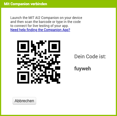 | 1. | Klickt im App Inventor oben auf Verbinden und wählt |