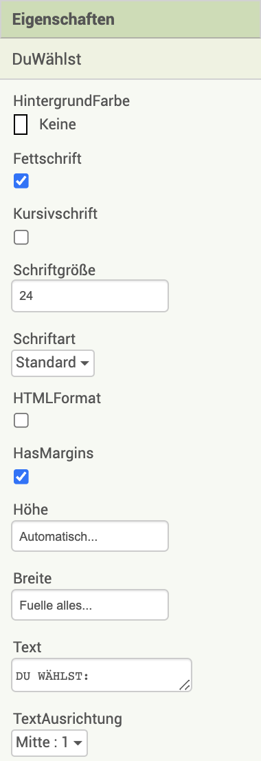 | 1. | Ihr könnt Schriftart und Schriftgröße von Damit der Text in der Mitte erscheint wählt bei Breite "Fuelle alles..." und bei TextAusrichtung "Mitte : 1". |