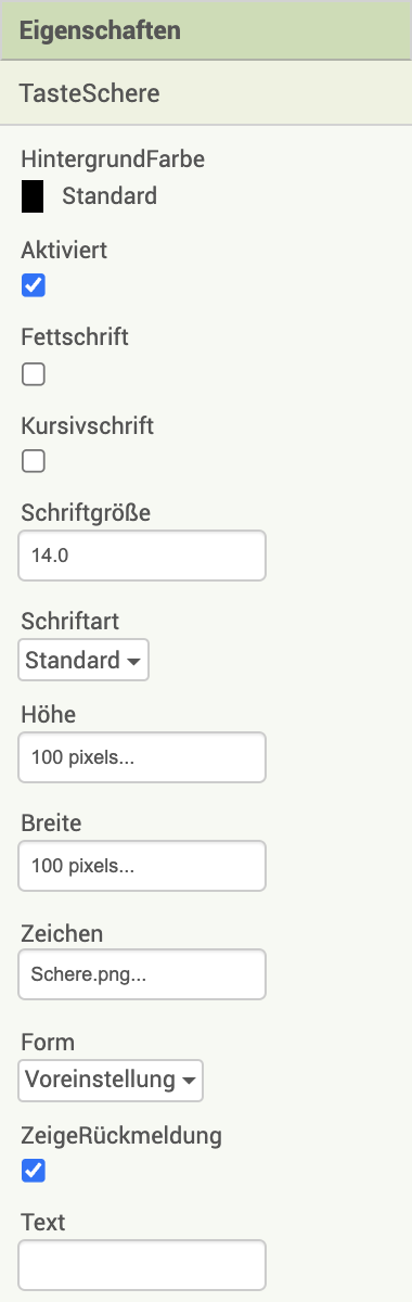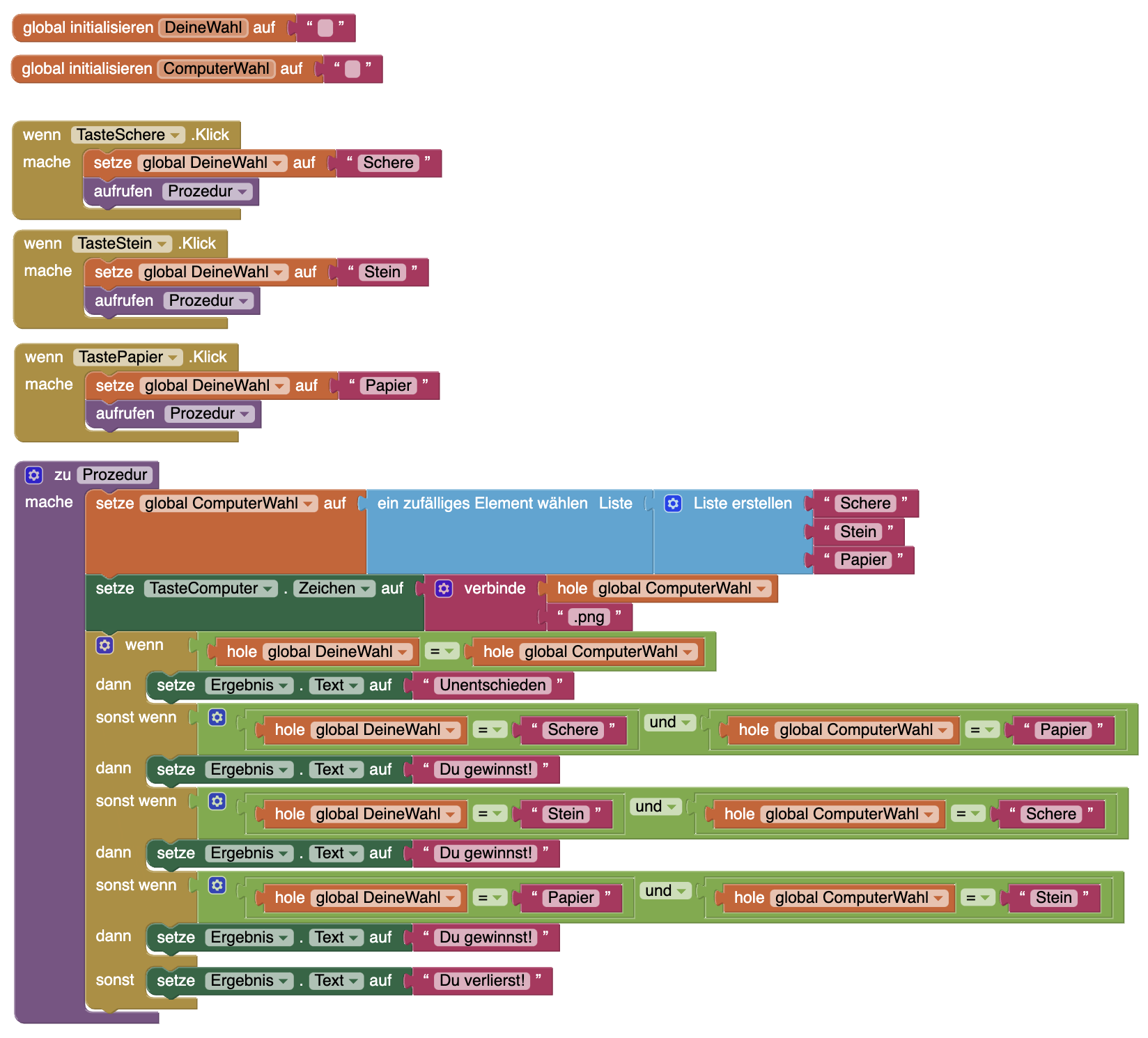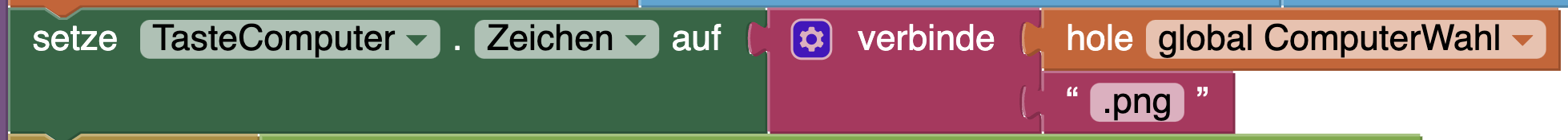 | 1. | Anstelle des Textes muss nun ein Bild als Antwort des Computers dargestellt werden. Ihr müsste deshalb die Stelle Anstelle des Wortes muss nun der Dateiname hinterlegt werden. Dieser besteht aus dem Wort und der Dateiendung .png, also Schere.png, Stein.png und Papier.png. Den Dateinamen erstellen wir aus der Verbindung von Wort und Dateiendung, verwendet dazu einen |