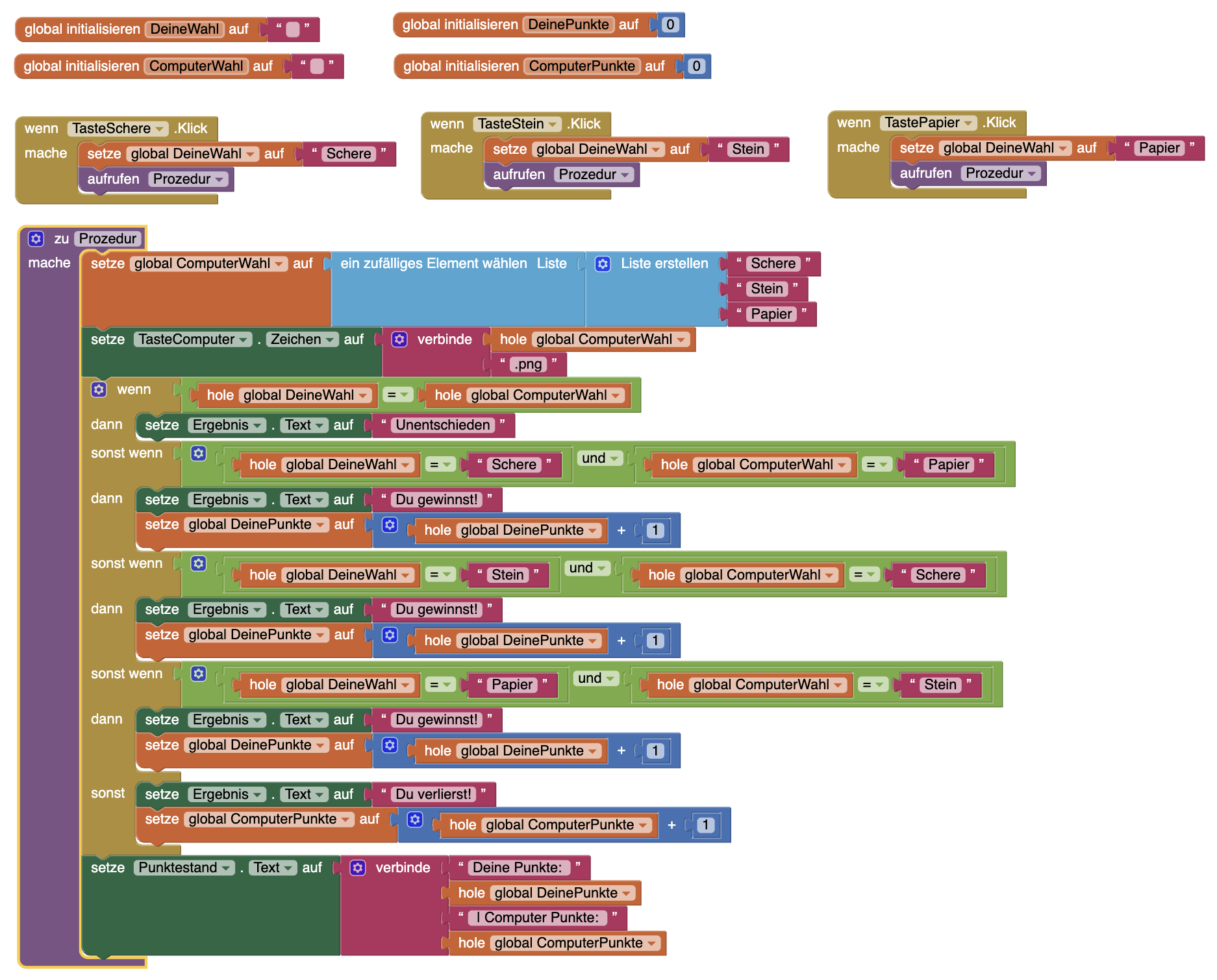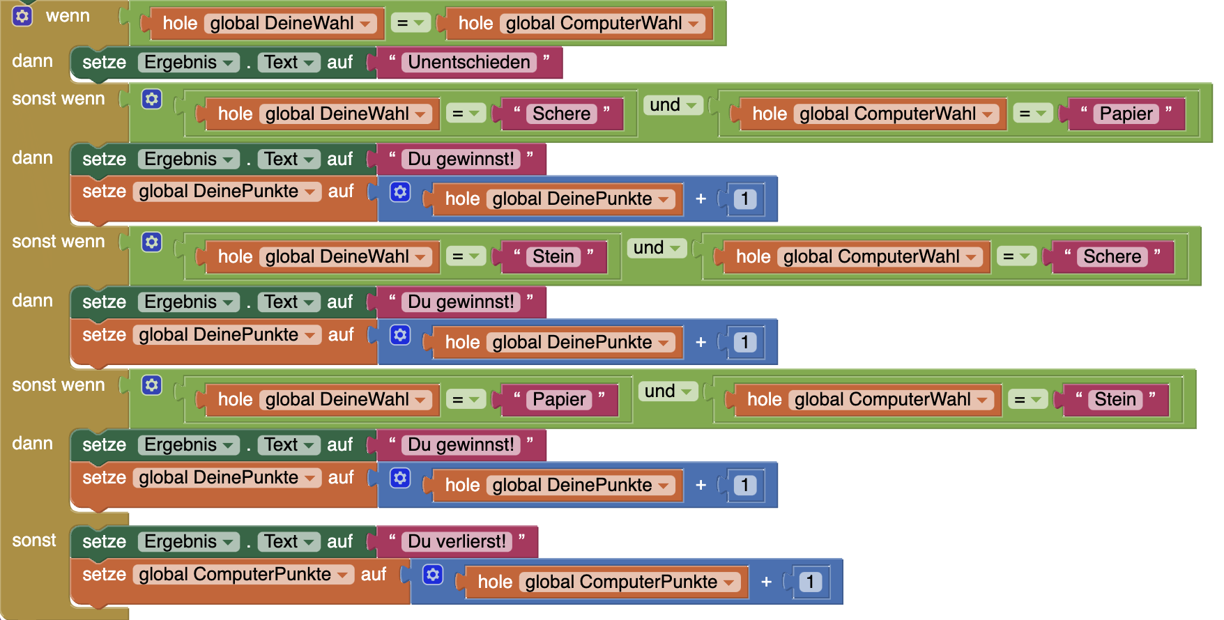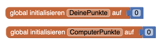 | 3. | Fügt diese Blöcke nun an den drei Stellen im Programm ein, an dem die Spielenden gewinnen. Ihr könnt die Blöcke dazu duplizieren, in dem ihr lange auf den Block tippt. Dupliziert die Blöcke erneut und ändert die Variablen um, so dass der Computer einen Punkt erhält. Fügt diese Blöcke an der Stelle im Programm ein, an der der Computer gewinnt. |