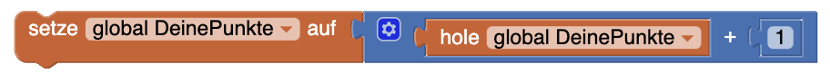 | 2. | Wenn die Spielenden gewinnen, erhalten sie einen Punkt auf ihren Punktestand in der Variable Gesetzt werden soll der aktuelle Wert + 1. Erstellt dazu einen +-Block aus dem Bereich Mathematik und fügt auf der linken seite den aktuellen Wert (hole-Block der Variable Erstellt einen setze-Block für die Variable |