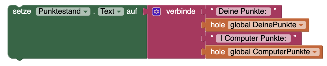 | 4. | Am Ende soll der aktuelle Punktestand in das neue Feld Erstellt dazu einen Mit einem verbinde-Block aus dem Bereich Text verbindet ihr folgende Bestandteile: