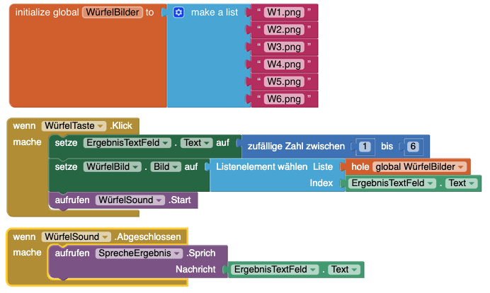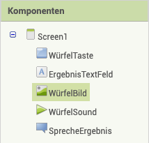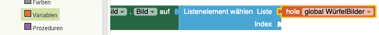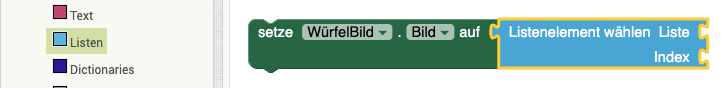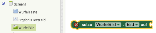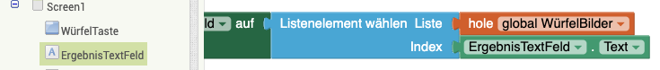 | 5. | Verknüpft die Elemente nun so, dass die Würfelseite auf die aktuell gewürfelte Zahl gesetzt wird. Euer Ergebnis sollte so aussehen: |