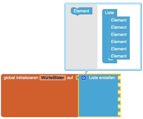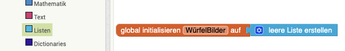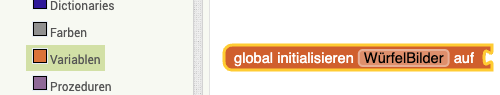 | 2. | Damit für jede gewürfelte Zahl ein anderes Würfelbild angezeigt wird benötigt ihr eine Liste. Erstellt für die Liste eine Variable ("global initialisieren") und gebt dieser einen passenden Namen. Der Name wird im späteren Verlauf wichtig sein. Eine global initialisierte Variable heißt, dass etwas festgelegt wird und man innerhalb eines Programms jederzeit darauf zugreifen kann. |