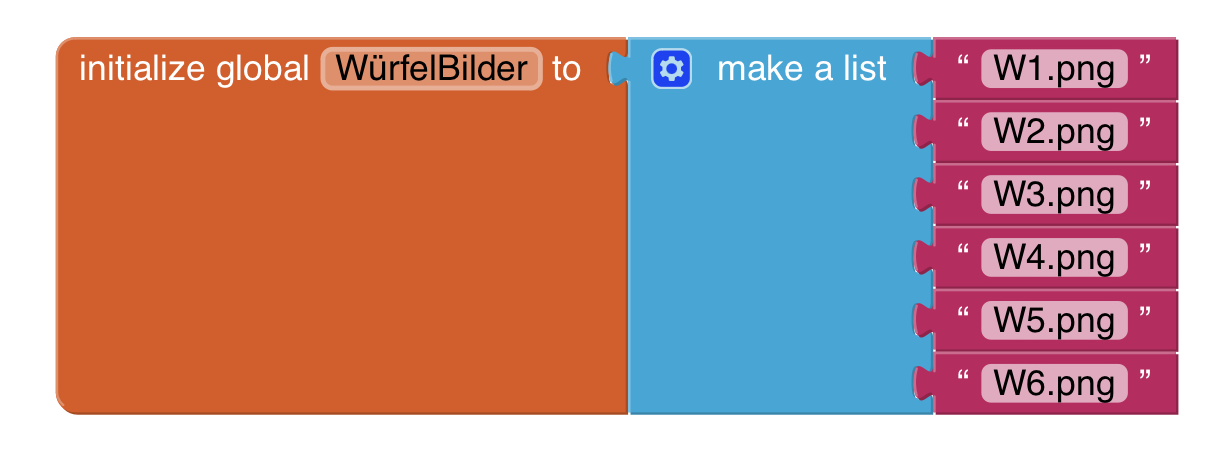 | 6. | Wiederholt diesen Schritt fünf Mal und benennt die Texte in "W2.png" bis "W6.png". Setzt die anderen Blöcke auch in die Liste und achtet dabei, dass "W1.png" an der ersten Position steht, "W2.png" an zweiter und so weiter. Tipp: Ihr könnt Elemente per Rechtsklick auch duplizieren. Auf Tablets müsst ihr mit dem Finger länger auf das Element drücken und warten bis das Kontextmenü erscheint. |