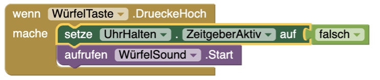 | 2. | Die Uhr muss deaktiviert werden, wenn die Würfel-Taste losgelassen wird. Erstellt einen weiteren setze-Block für die Uhr mit der Eigenschaft |