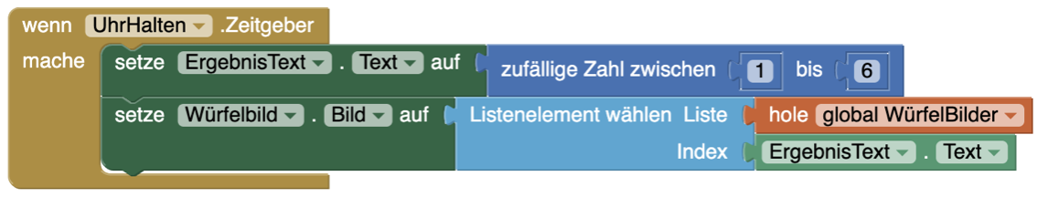 | 3. | Erstellt ein Zeitgeber-Ereignis für die Uhr. Dieses Ereignis wird immer wieder aufgerufen, wenn die Uhr "tickt". Mit jedem Ticken soll neu gewürfelt und das Ergebnis dargestellt werden. |