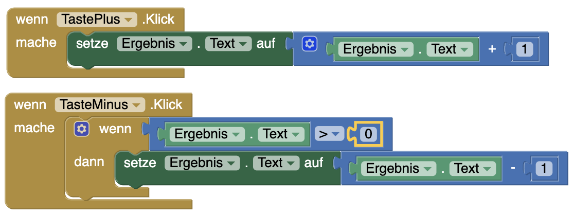 Damit der Zähler nicht negativ wird, müssen wir beim Klick auf die Minus-Taste zusätzlich prüfen, ob die Zahl größer als 0 ist.