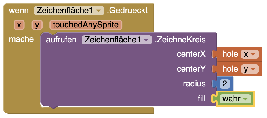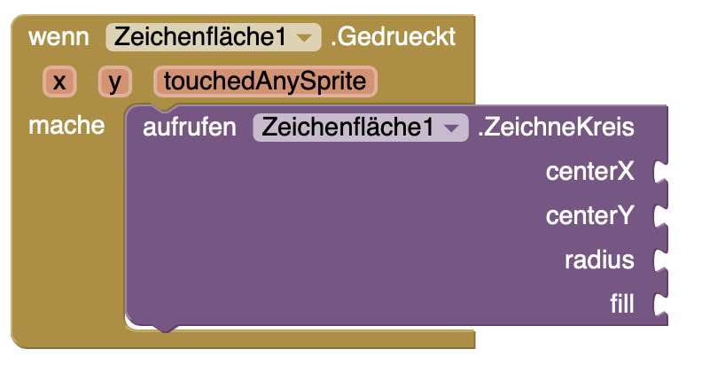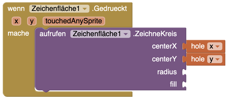 | 3. | Verknüpft die Blöcke sinnvoll: Wenn auf die Zeichenfläche gedrückt wird, soll ein Kreis gezeichnet werden. |