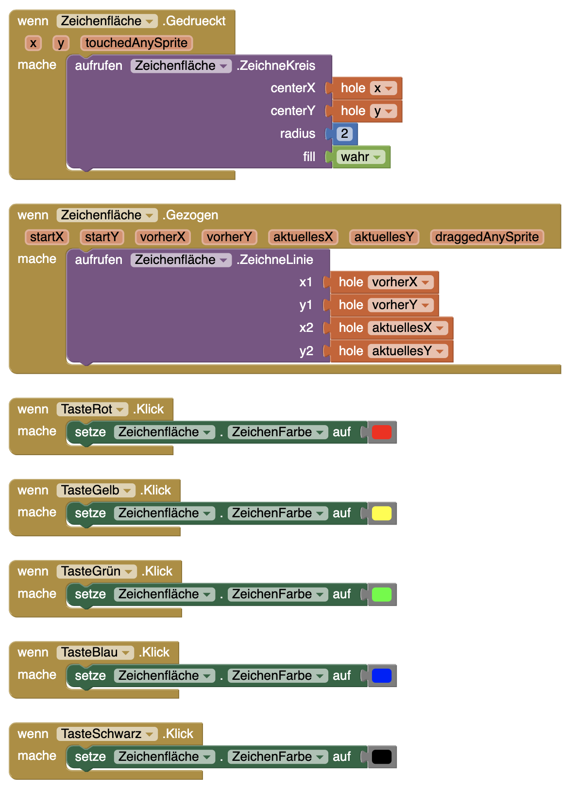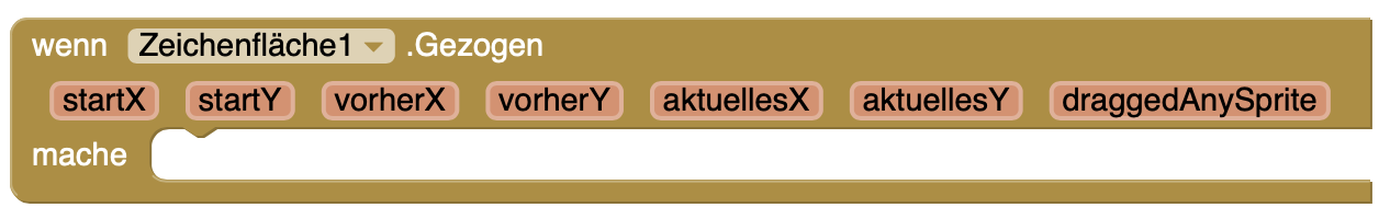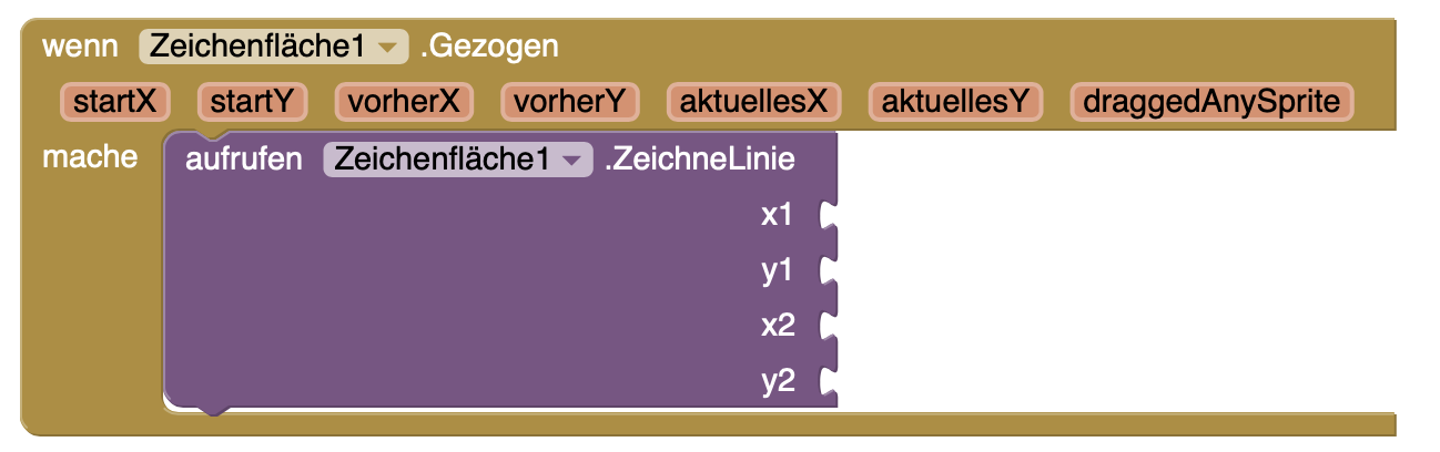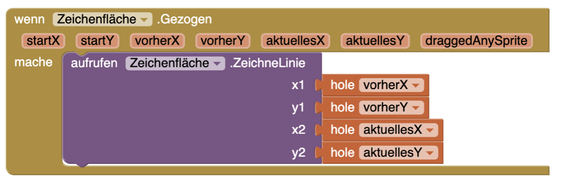 | 3. | Damit eine Linie gezeichnet wird, müsst ihr einen Startpunkt (vorherX, vorherY) und einen Endpunkt (aktuellesX, aktuellesY) angeben. Diese Punkte holt ihr euch aus dem Gezogen-Event. |