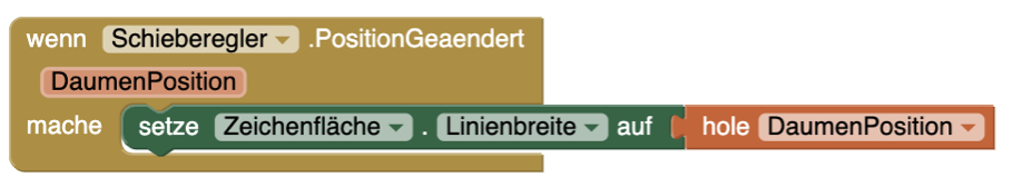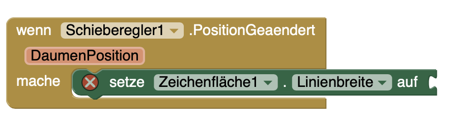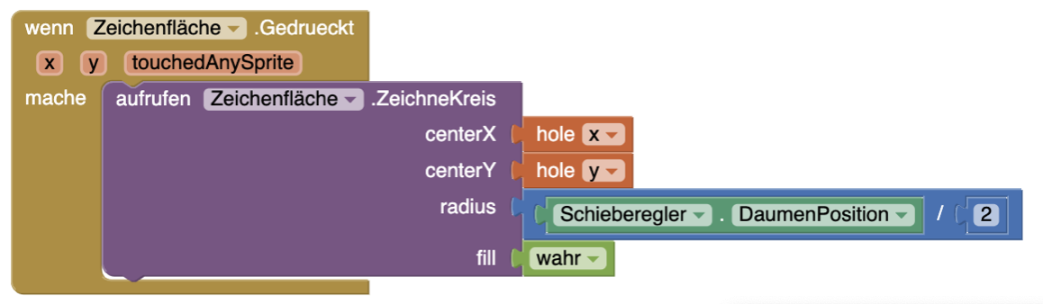 | 4. | Für die ZeichneKreis-Funktion könnt ihr den Radius nun ebenfalls von der Schieberegler-DaumenPosition abhängig machen. Damit die Linie gleich breit ist, müsst ihr den Durchmesser durch Zwei teilen, um den Radius zu berechnen. |